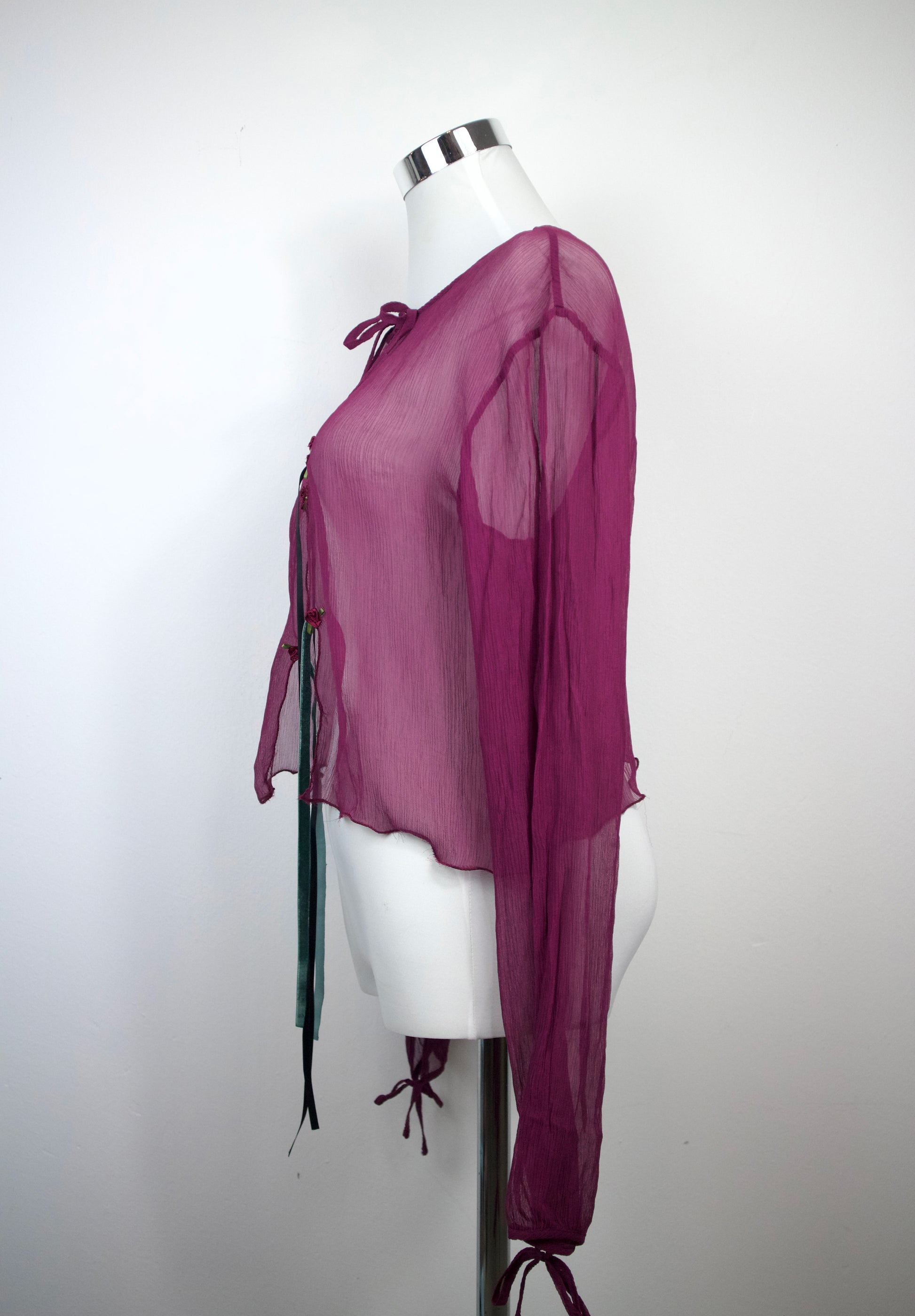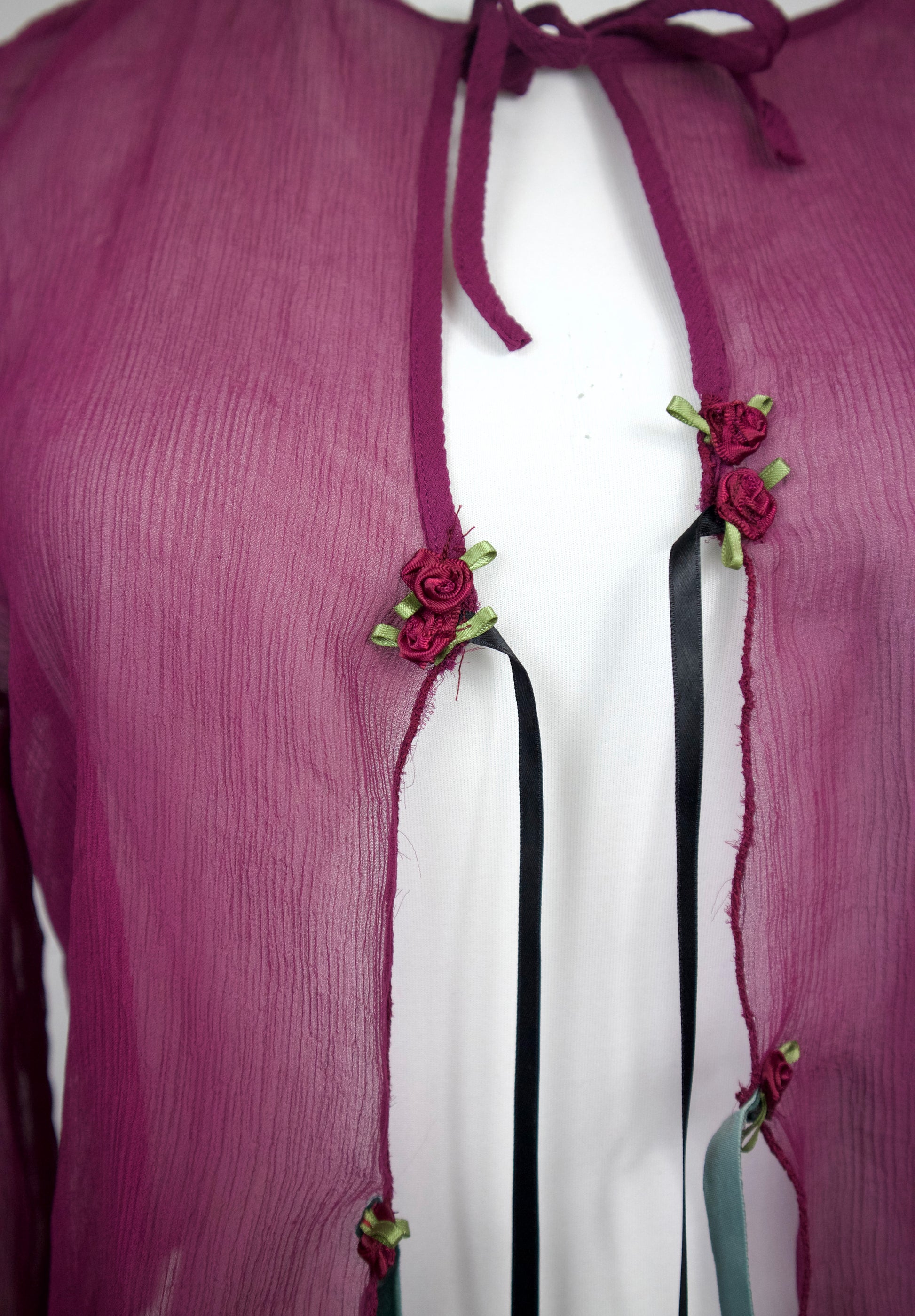 Cardigan aus dünnem Chiffon Stoff (Upcycling) mit Schleifen und Rosen.