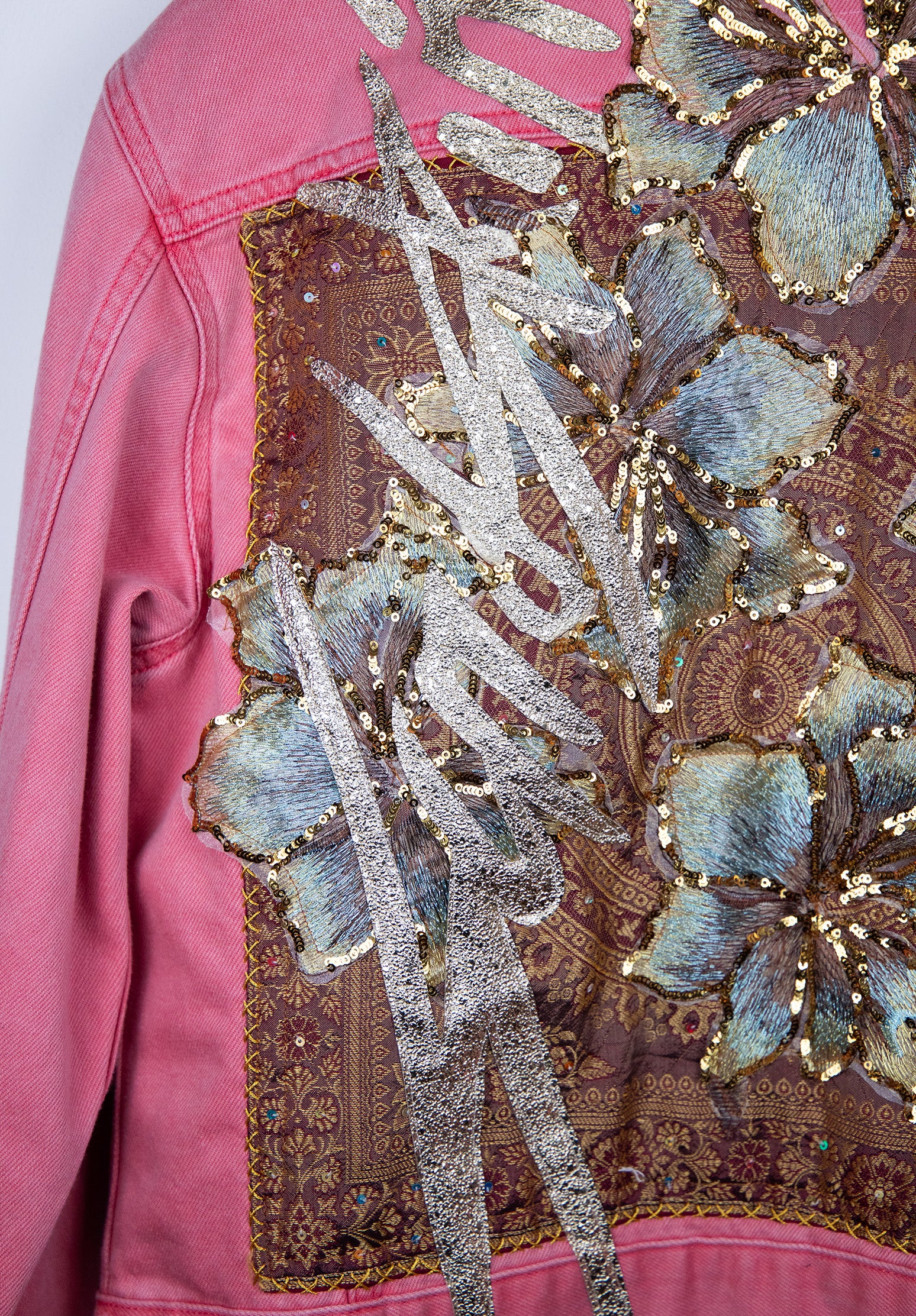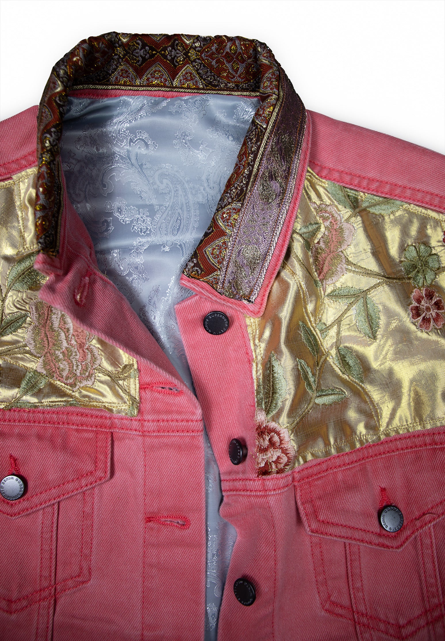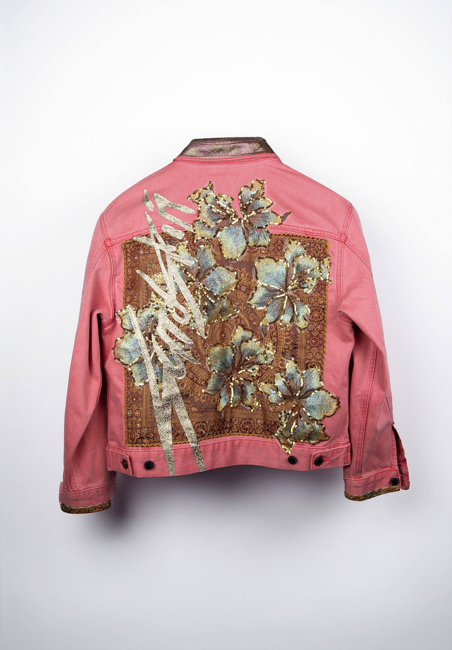 Vintage Jeansjacke in Rosa mit goldener Schrift aus veganem Leder.