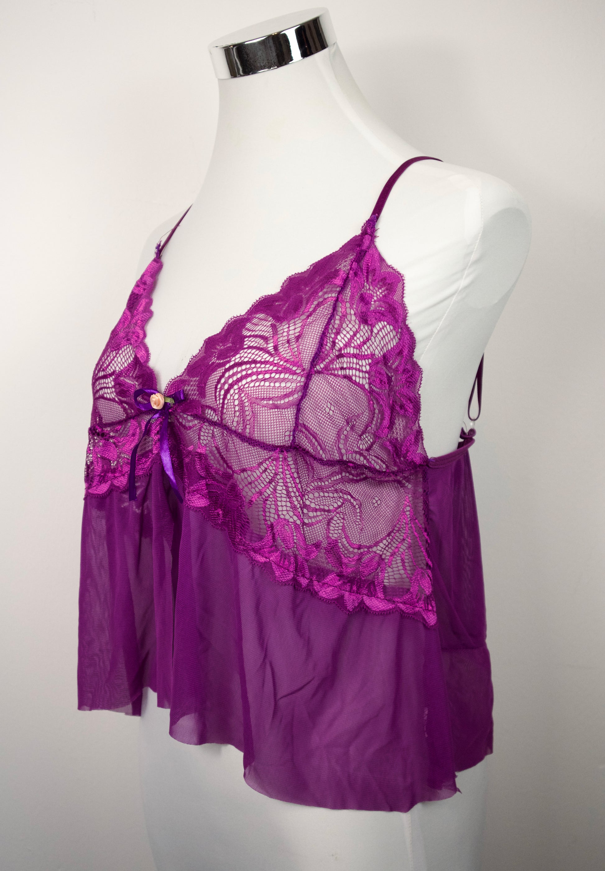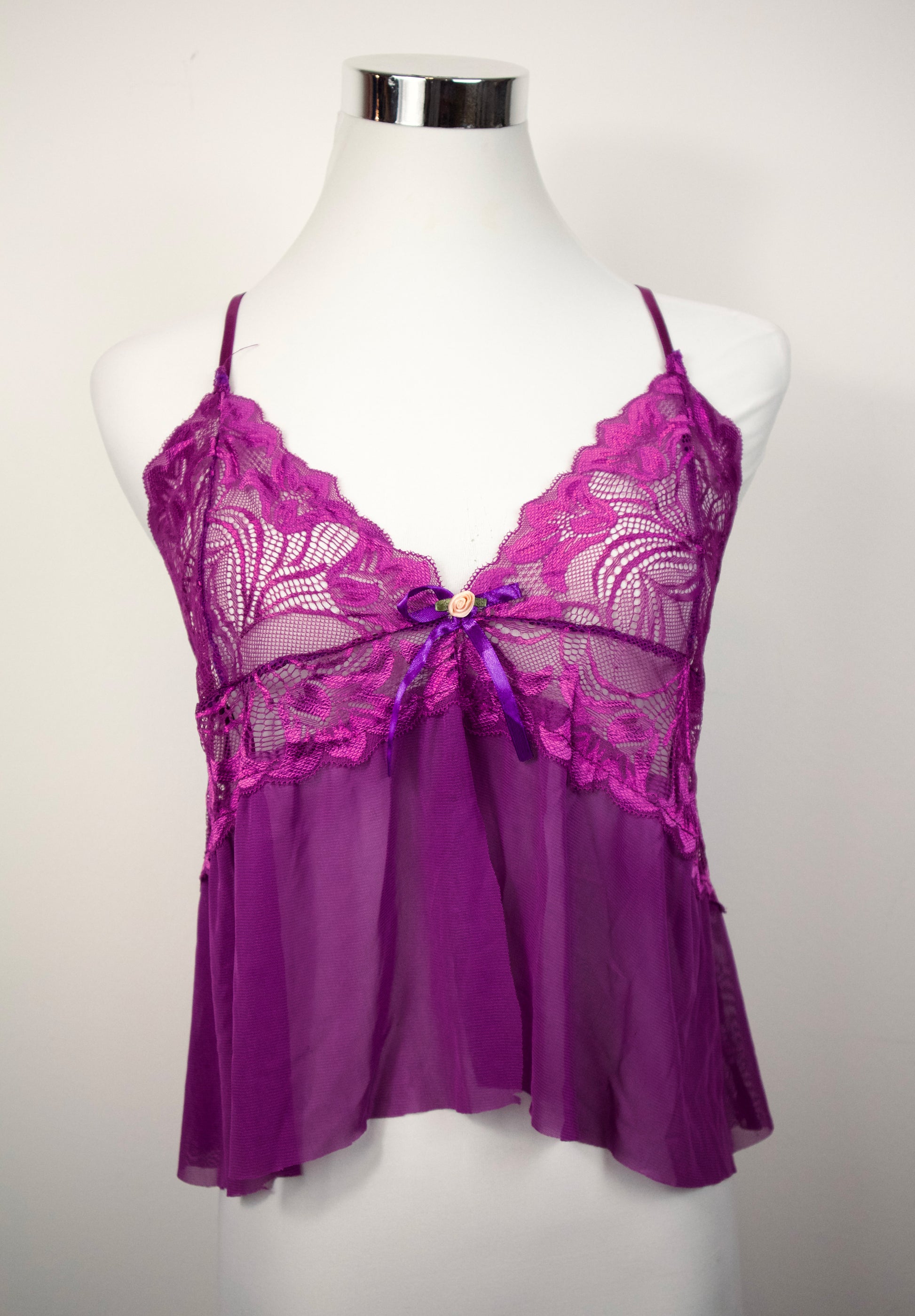 Vintage Top (Upcycling) in knalligem Pink-Lila mit Spitzen Akzenten.