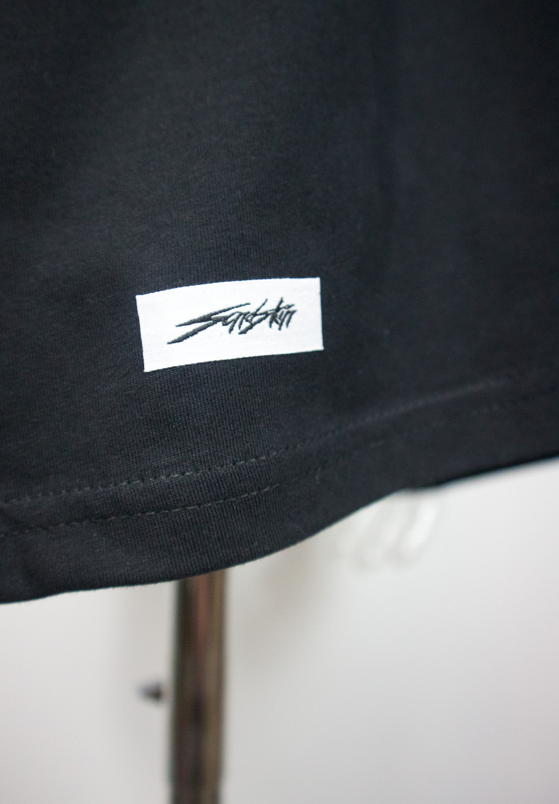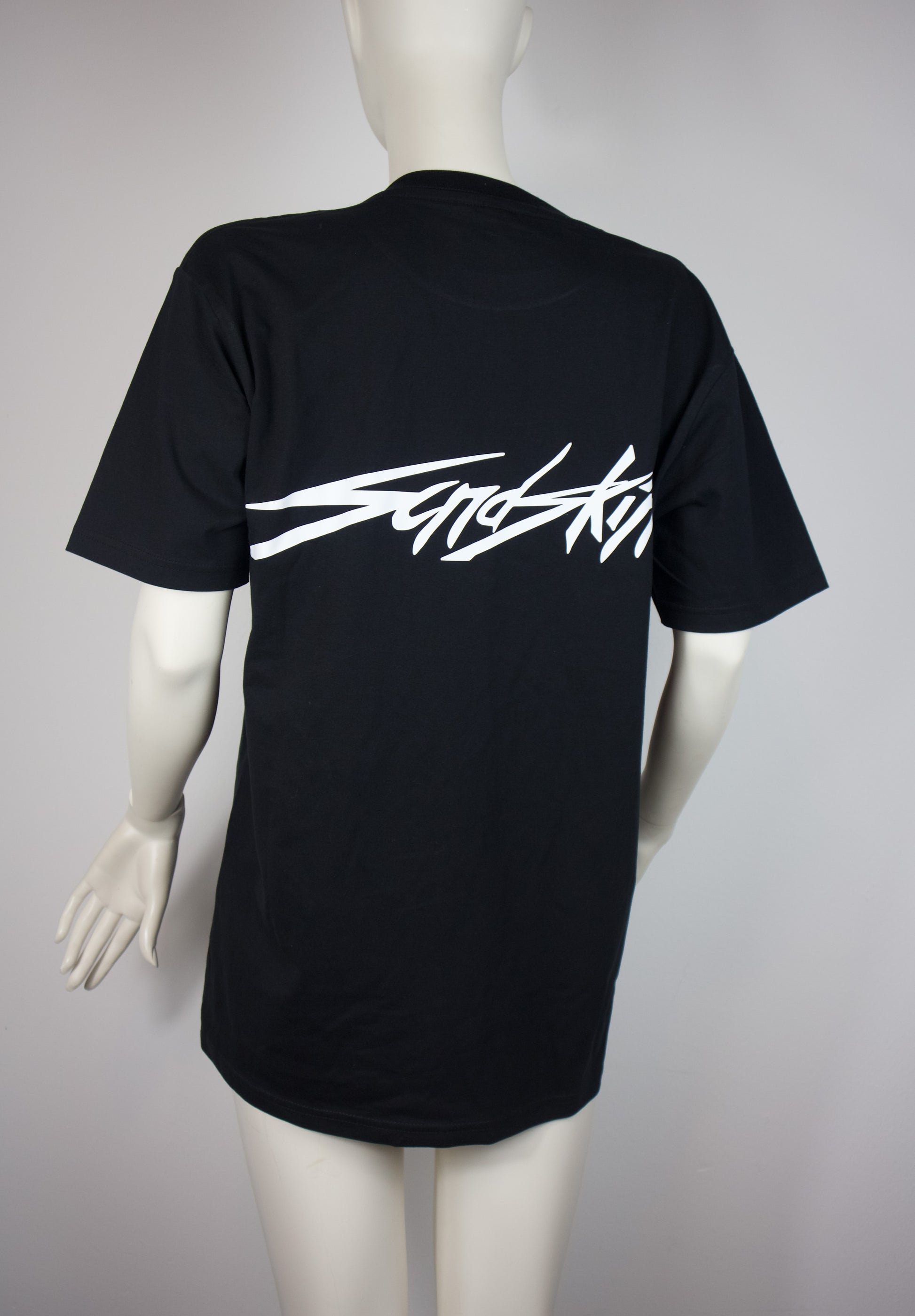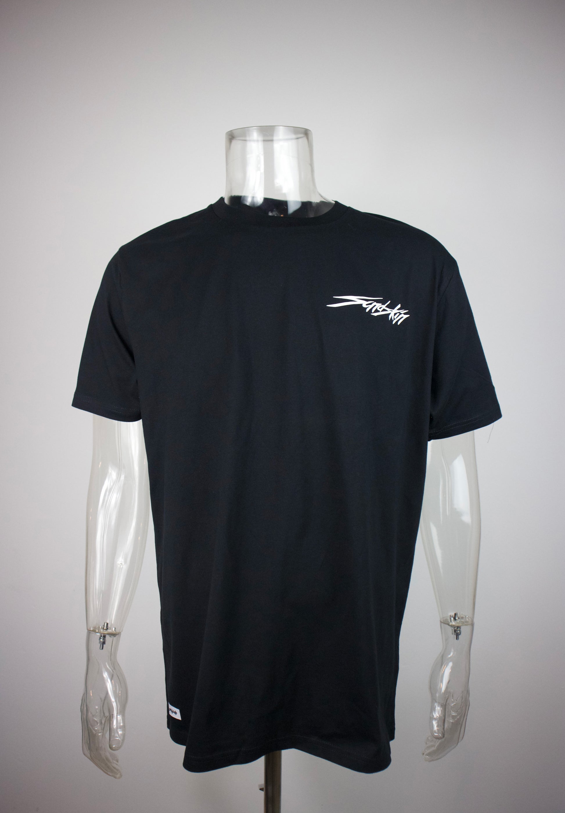 Schwarzes T-Shirt aus Bio-Baumwolle, mit weißem Schriftzug auf Rück-und Vorderseite.
