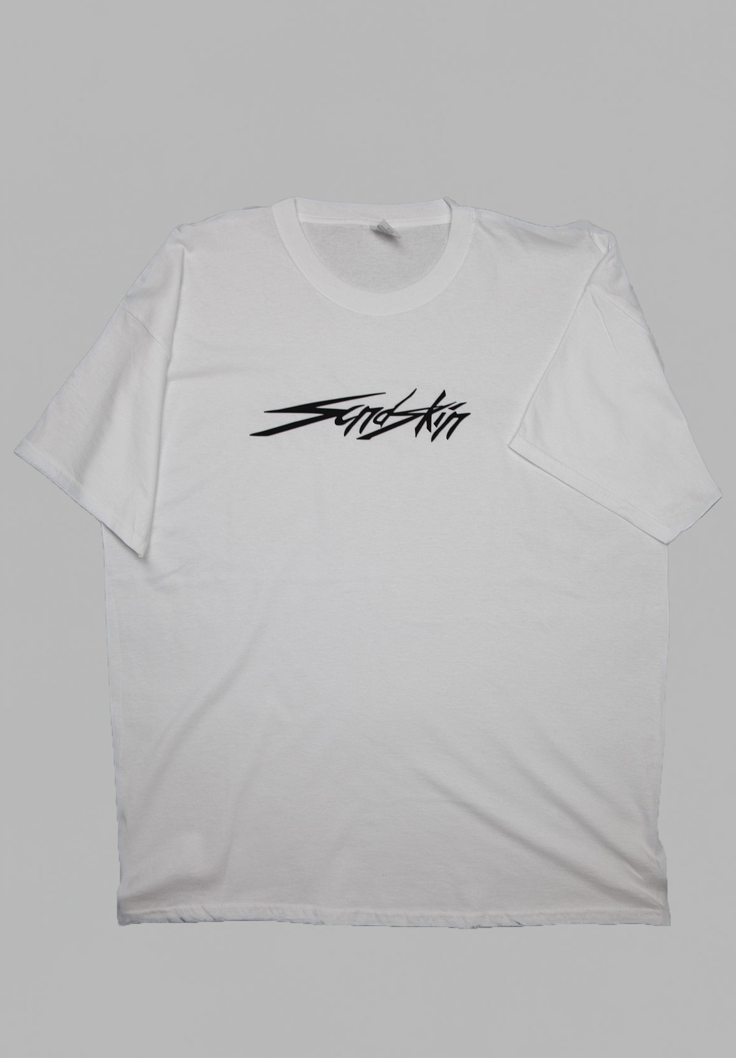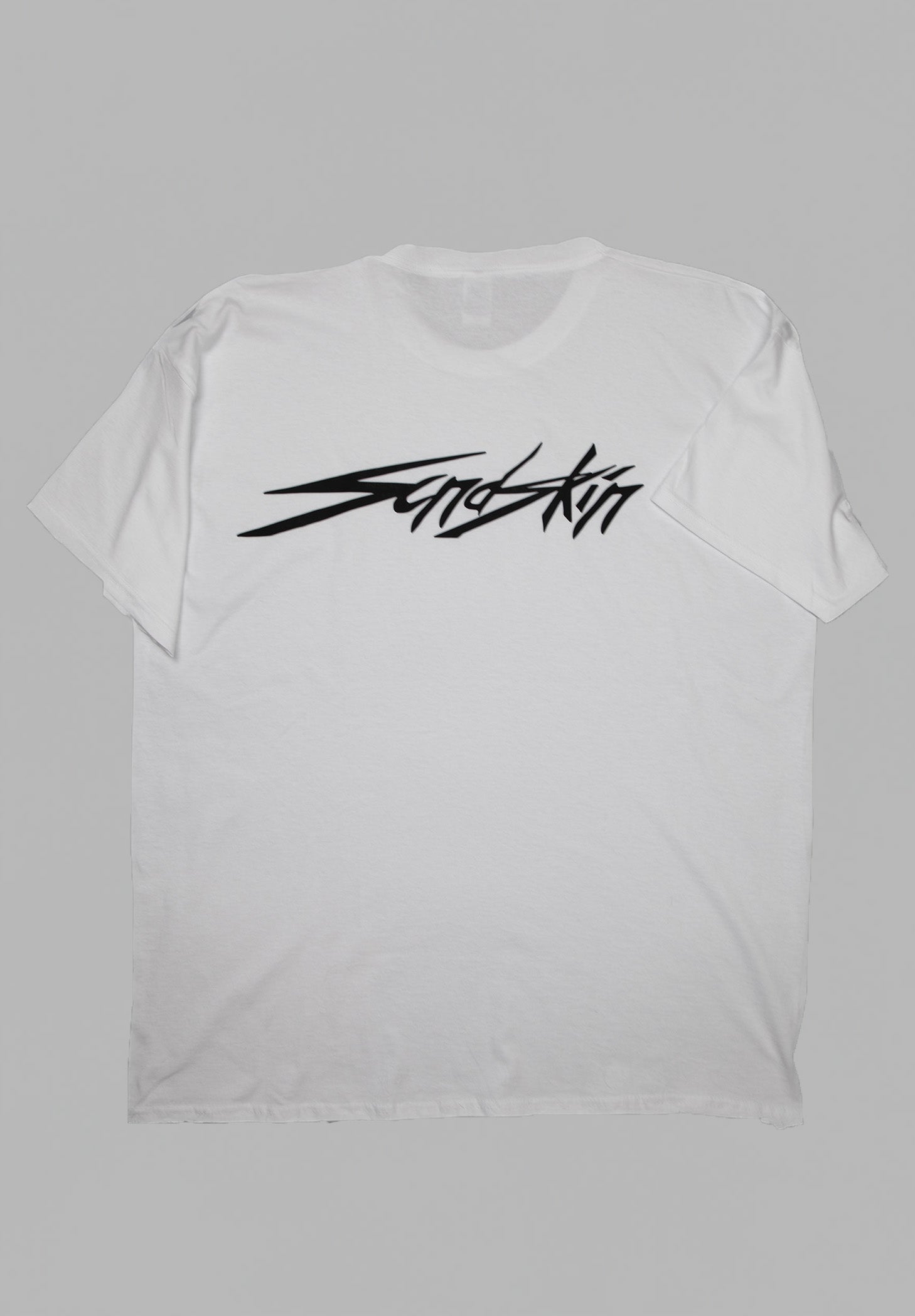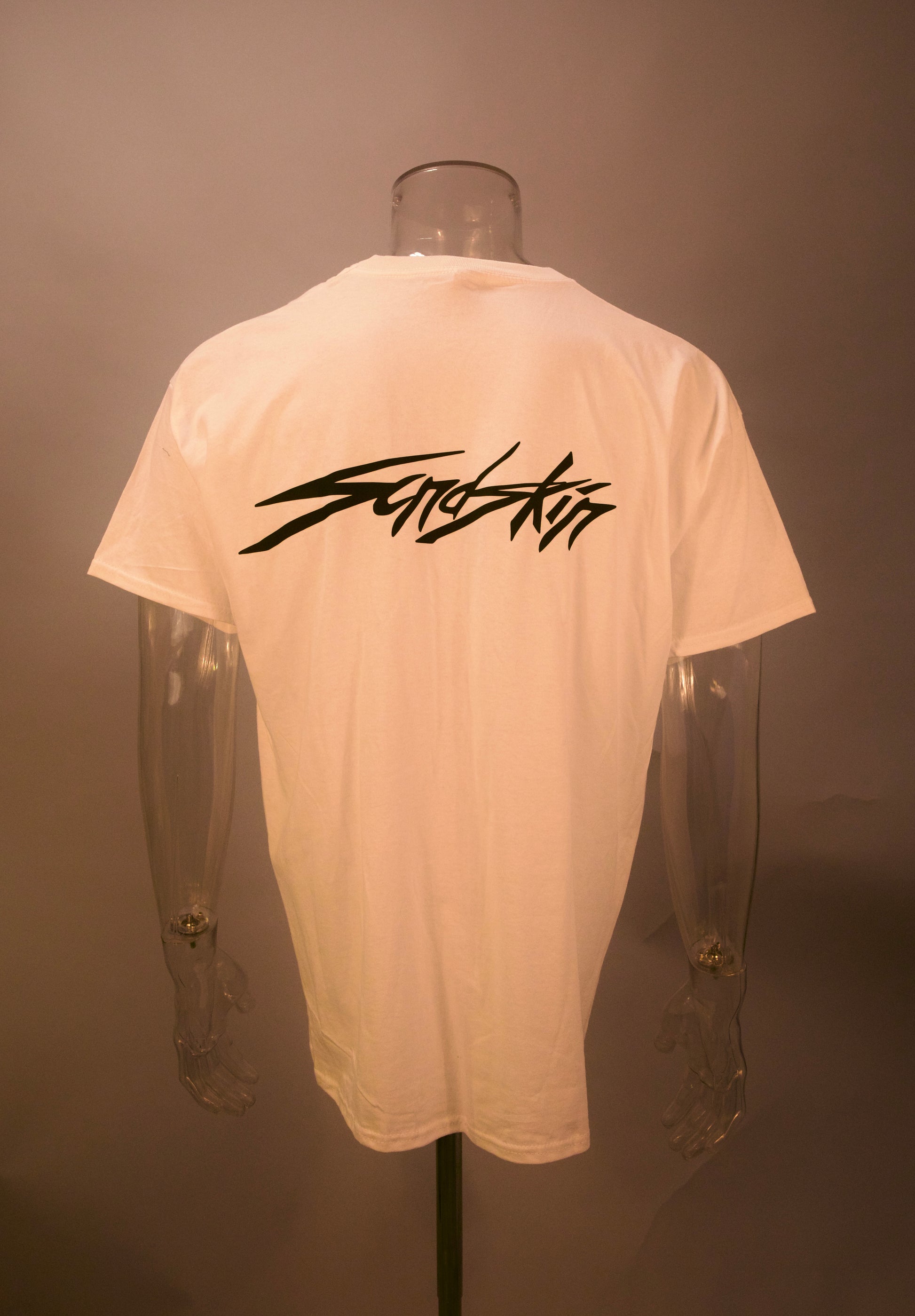 Weißes T-Shirt mit schwarzem Schriftzug auf der Rückseite und schwarzem Logo auf der Vorderseite.