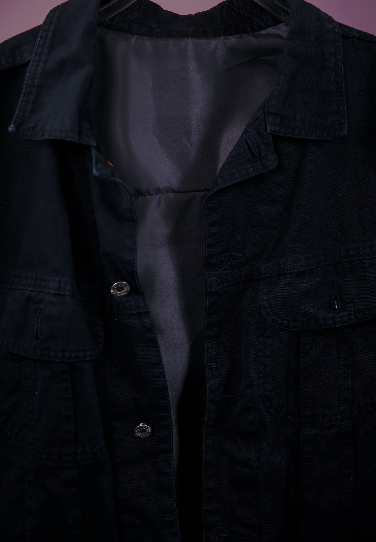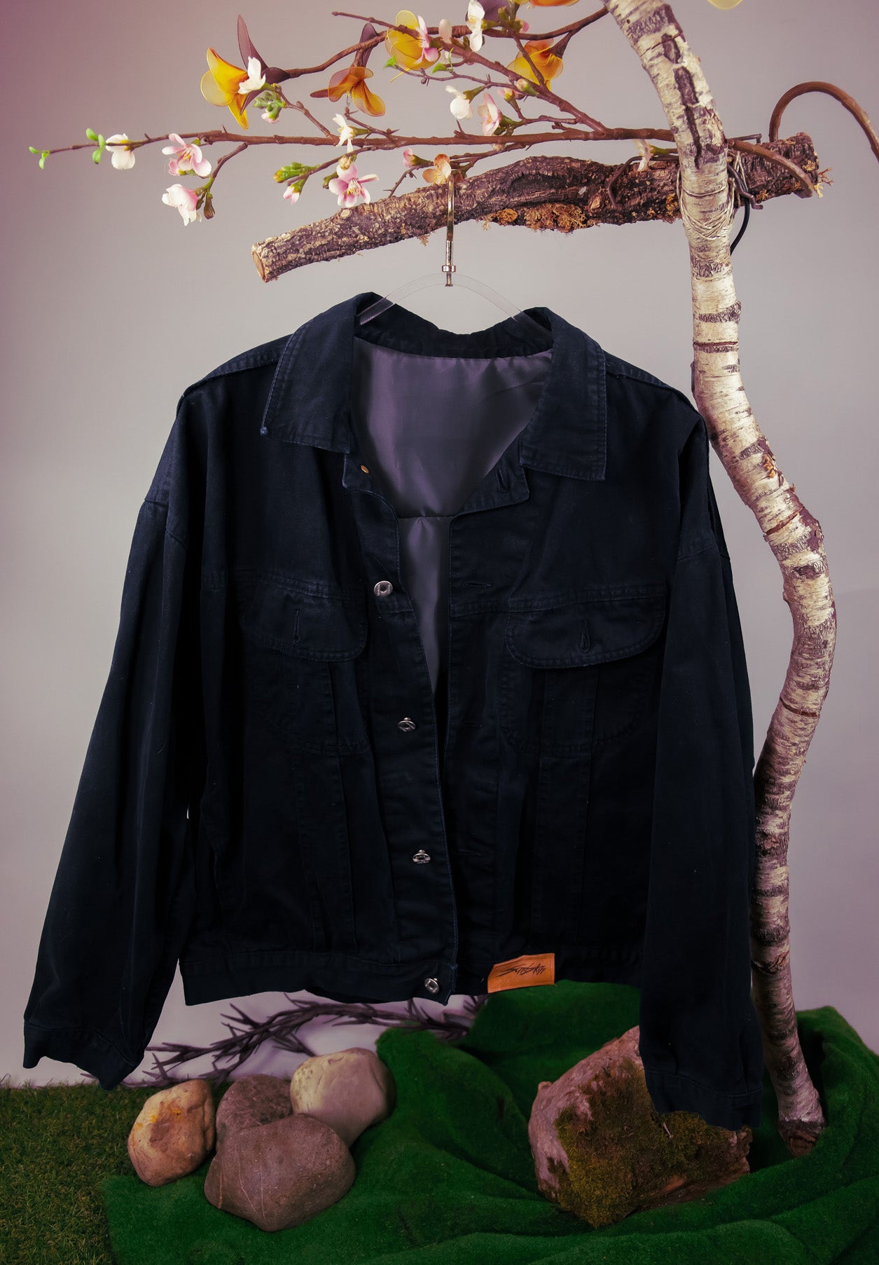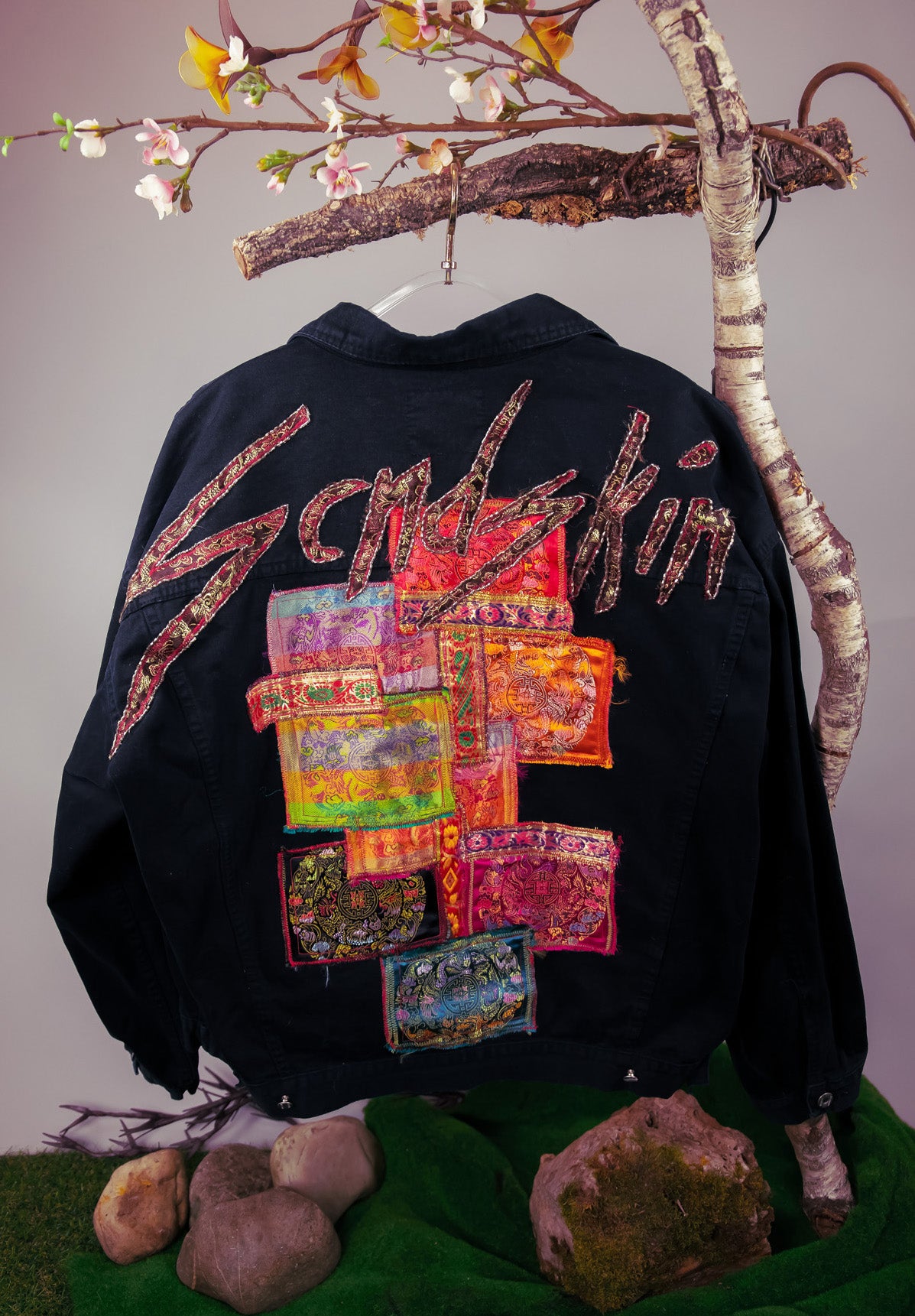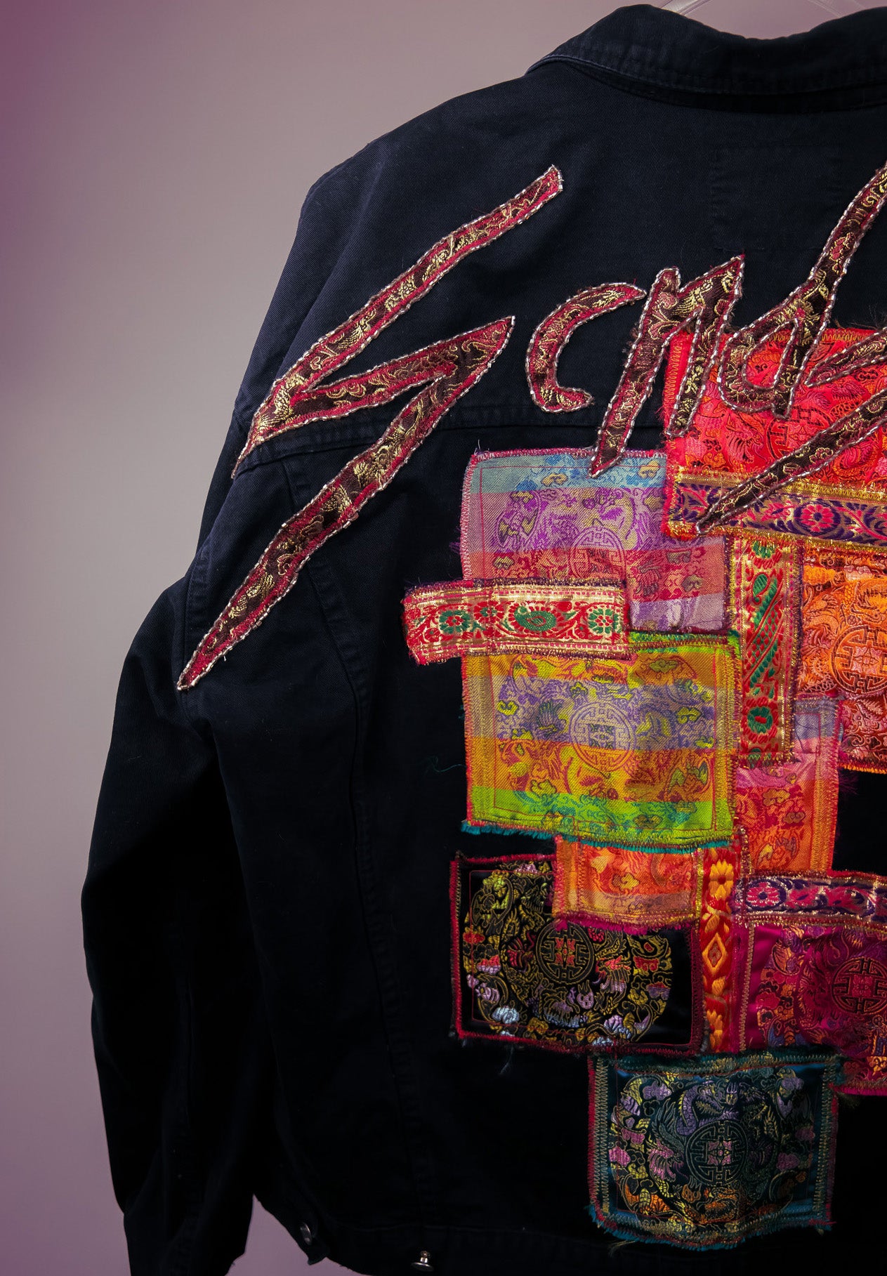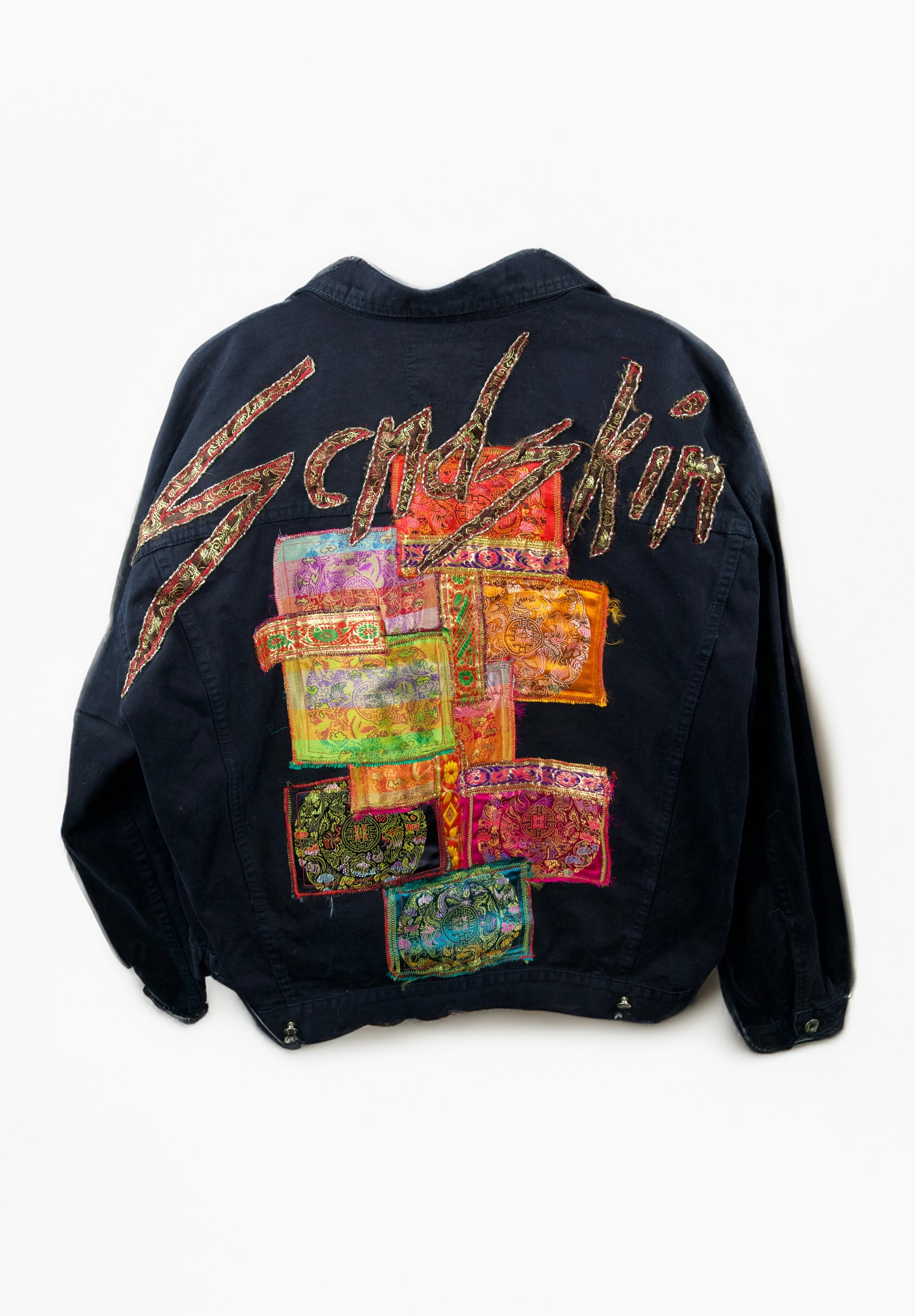 Vintage Jeansjacke in Dunkelblau mit Perlen umrandetem Schriftzug.
