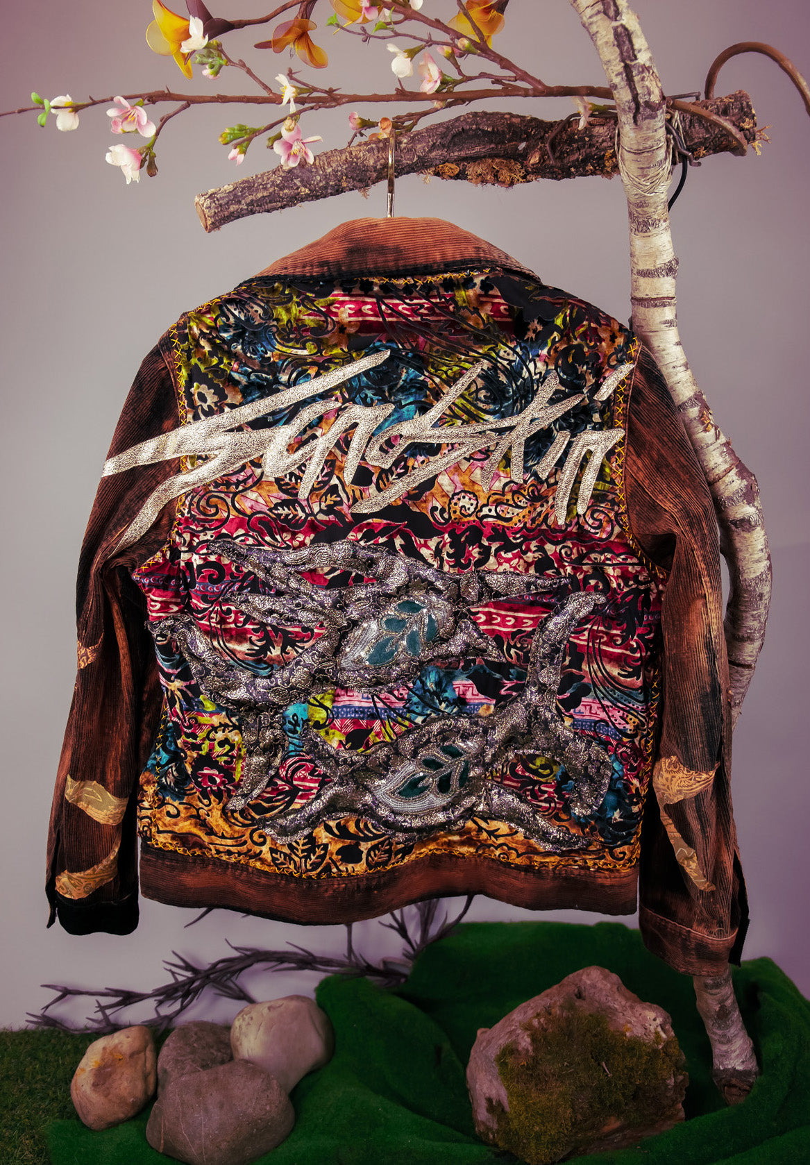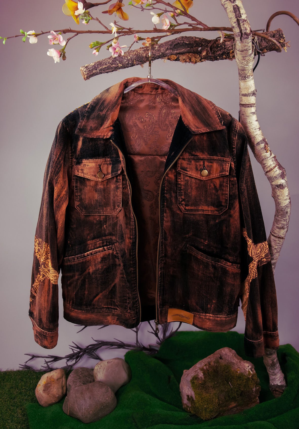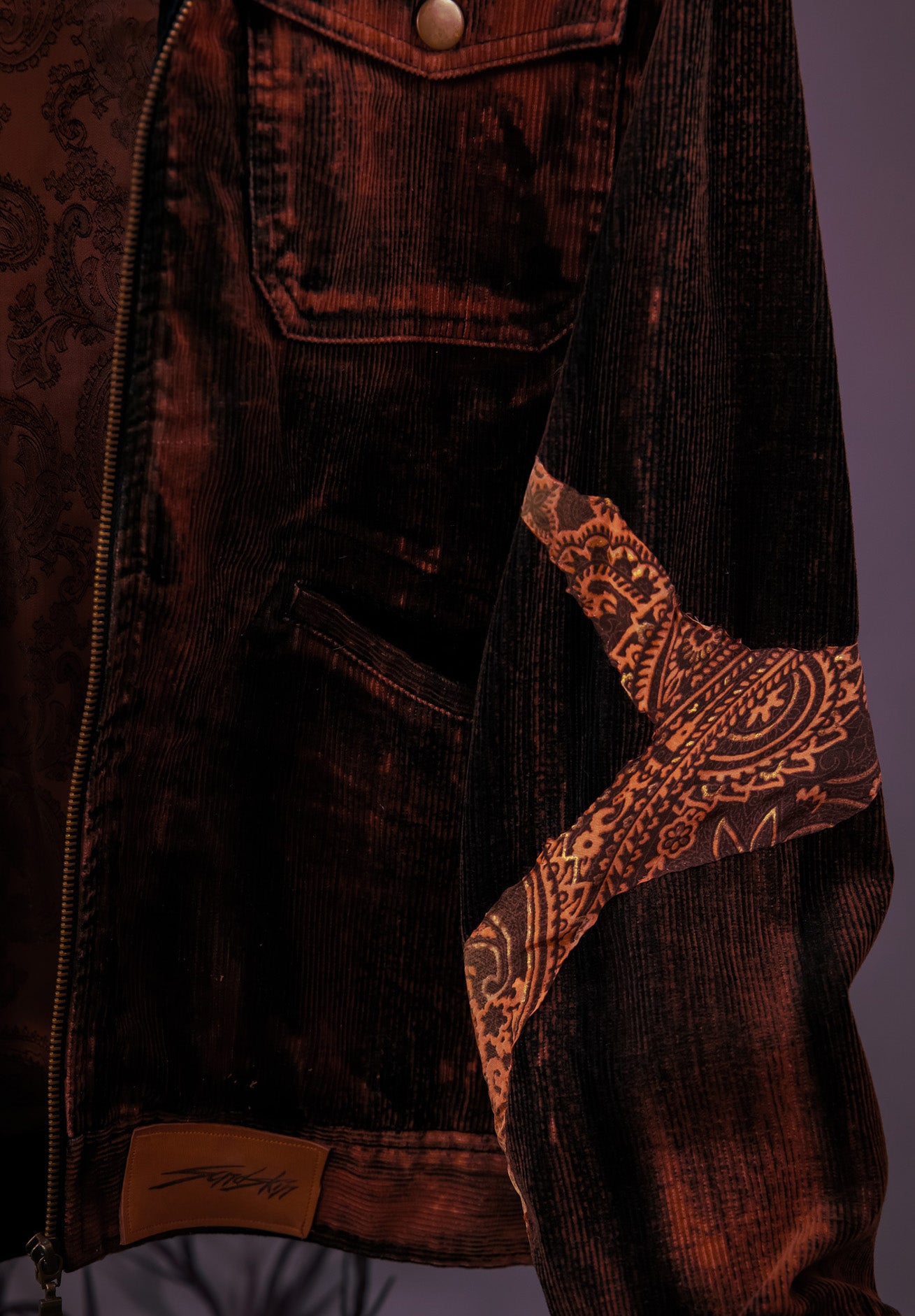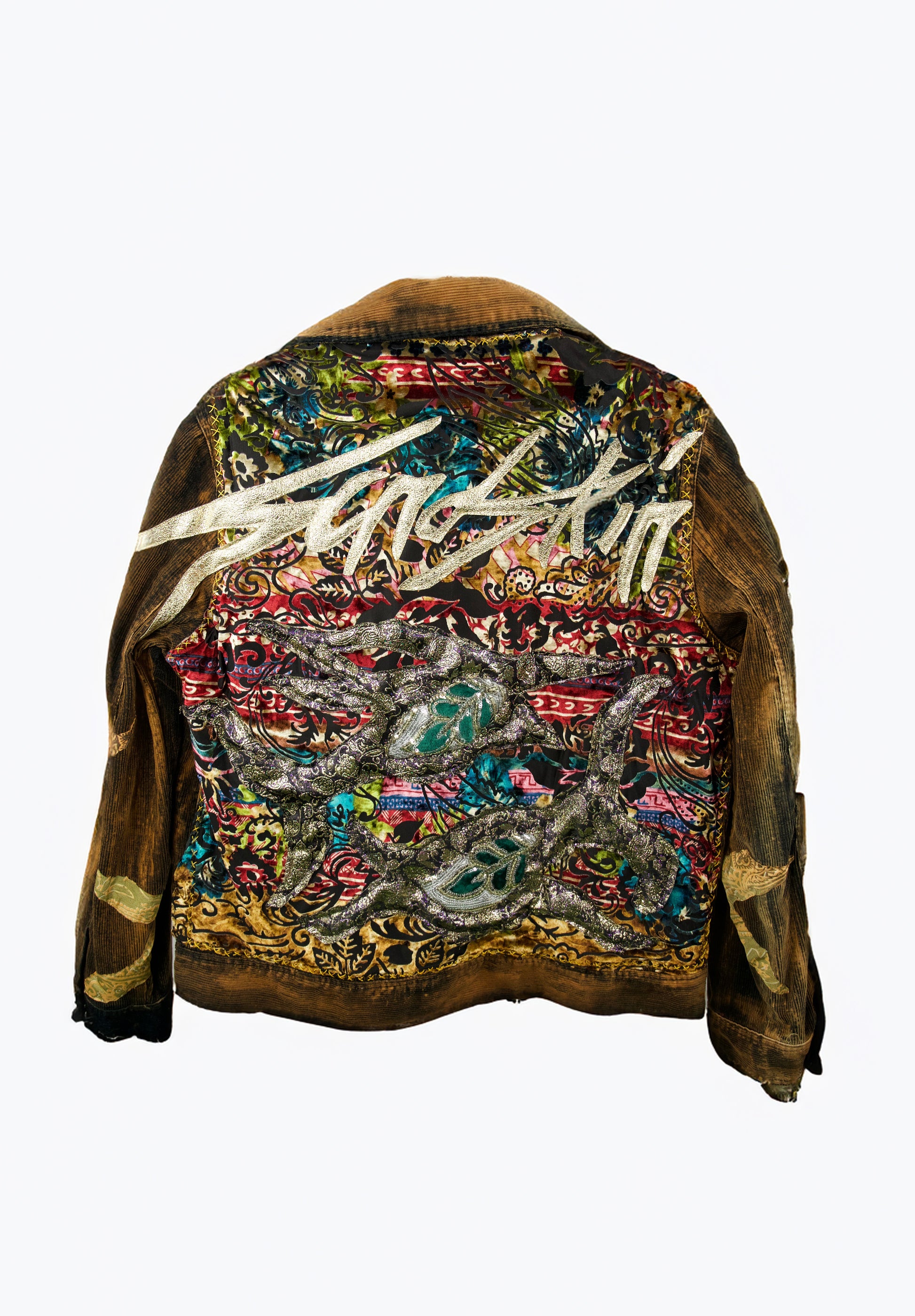 Vintage Cordjacke in Schwarz/ Orange mit goldenem Schriftzug aus veganem Leder.